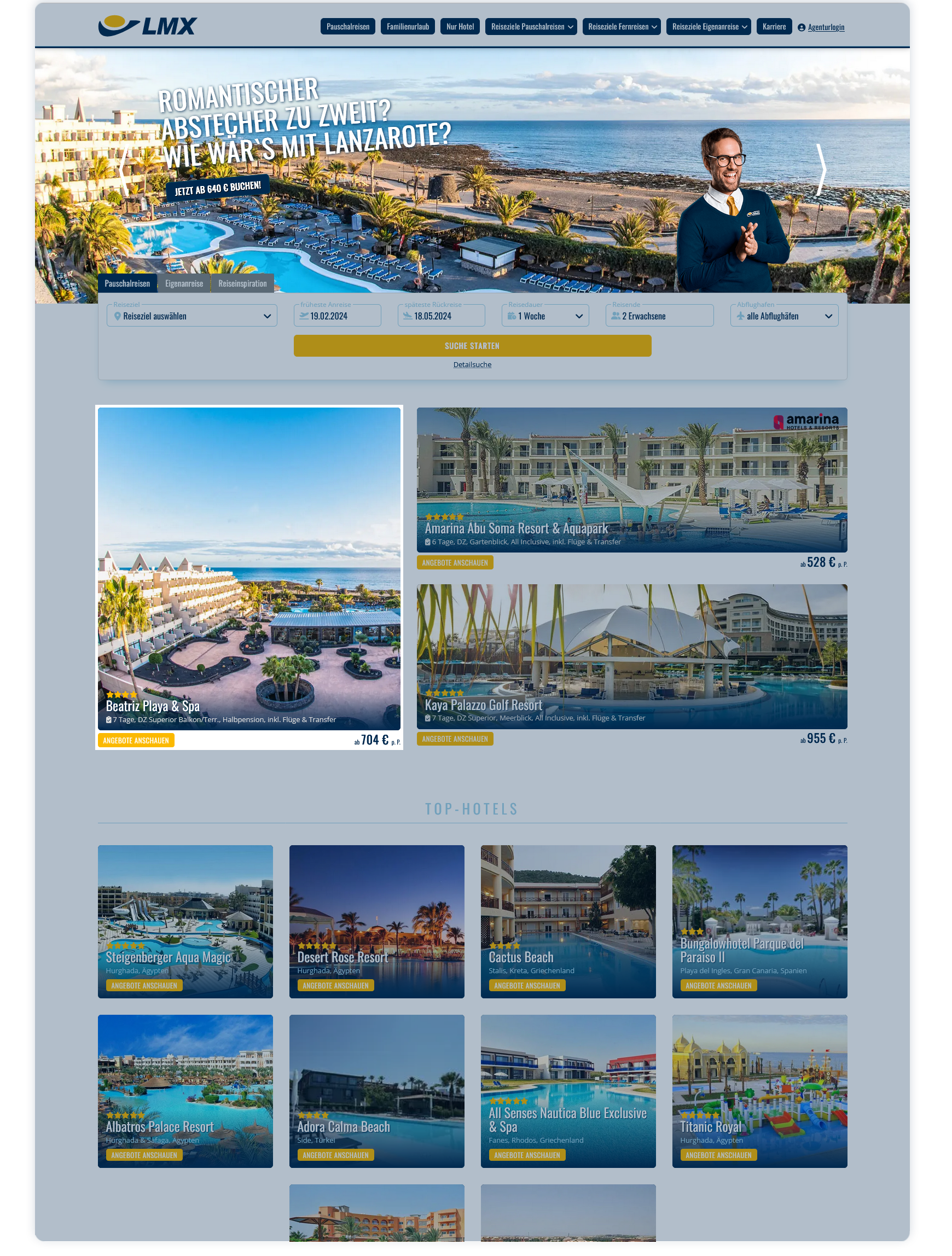 We are a Germany-based tour operator specializing in dynamically packaged travel products. By combining daily updated flights, hotel accommodations, and additional travel services, we create flexible and individually tailored package holidays with a high level of product diversity at competitive market prices.